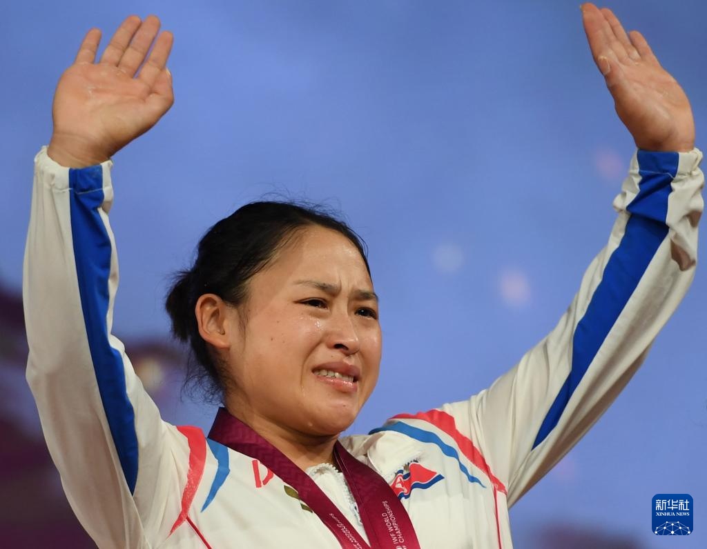 10月2日,朝鲜选手李圣琴在颁奖仪式上。她以抓举91公斤、挺举122公斤、总成绩213公斤包揽三枚金牌,并打破挺举、总成绩两项世界纪录。