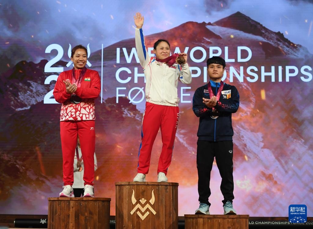 10月2日,举重级挺举季军挺举冠军朝鲜选手李圣琴(中)、世锦赛中手李树妙亚军印度选手米拉拜(左)和季军中国选手李树妙在颁奖仪式上。国选公斤国产精品久久久久影院色