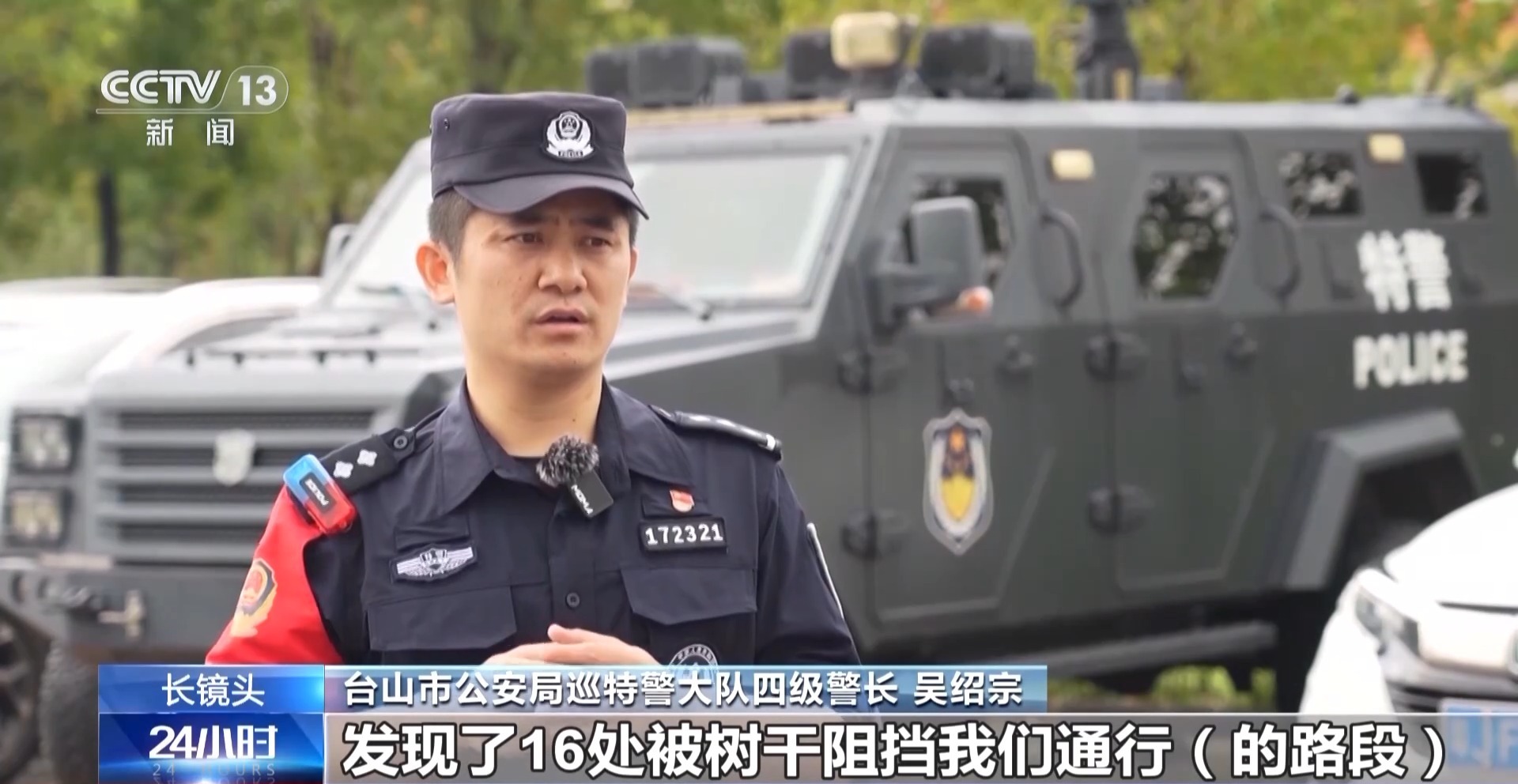 台山市公安局巡特警大队四级警长 吴绍宗:整个行动过程中,发现了16处被树干阻挡我们通行的路段,当时就按照人员分工,一人使用排障工具,一人负责辅助搬运,第三人是负责安全观察,防止其他次生危险发生。