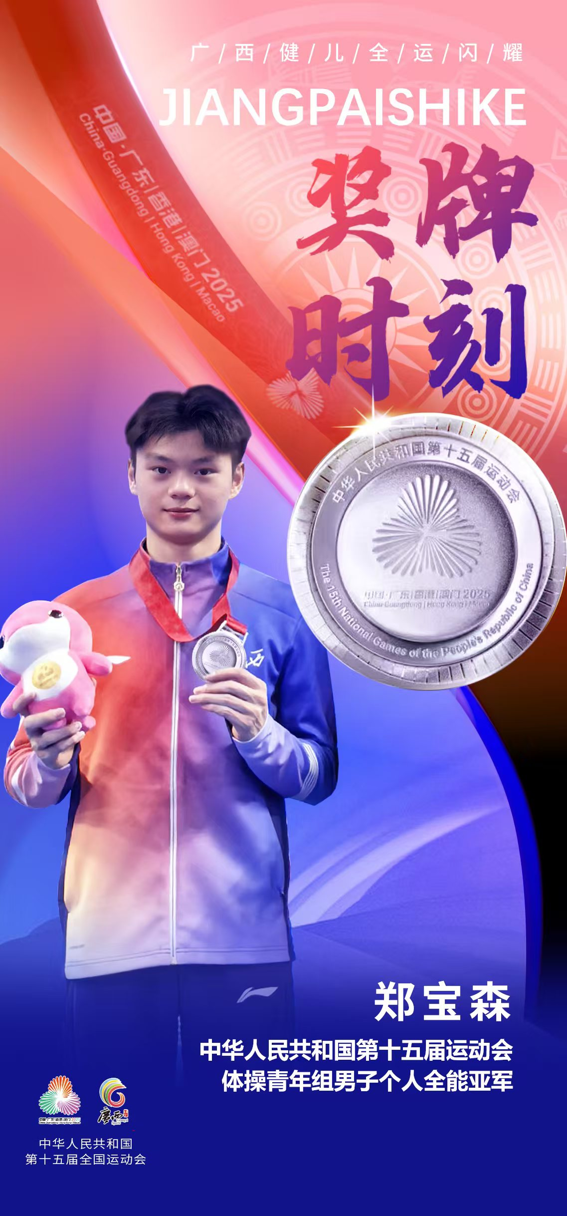 第十五届运动会体操青年组男子个人全能冠军杨兰斌、斌郑宝森亚军郑宝森。拿下年组自治区体育局供图